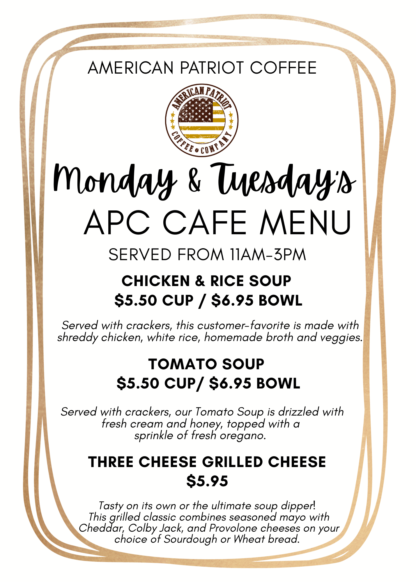 Located in the Cultural District of Camden, South Carolina, American Patriot Coffee Company (APC) is a coffeehouse and Kershaw County’s only coffee roastery --- a place where you’ll meet friends to catch up over a latte, converse with business associates or simply have a moment of zen with fantastic coffee and treats. We proudly serve our freshly roasted coffee, handcrafted lattes, teas and other coffeehouse favorites, plus an array of homemade pastries, fresh salads, sandwiches and specialty gourmet foods.